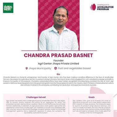 Chandra Prasad Basnet, founder of Agri Center Jhapa Pvt. Ltd., has transformed traditional farming in Nepal by pioneering banana cultivation. Inspired by his training at Kinneret College in Israel under the “Learn and Earn” program, he employs advanced agricultural technologies such as drip irrigation, precision agriculture, and sustainable fertilization. Starting with 1,000 banana saplings, his farm now spans over 6 hectares, producing 50,000 banana bunches annually. He cultivates multiple banana varieties, markets them across Nepal, and shares his expertise with local farmers, promoting modern farming practices and innovation in the region.